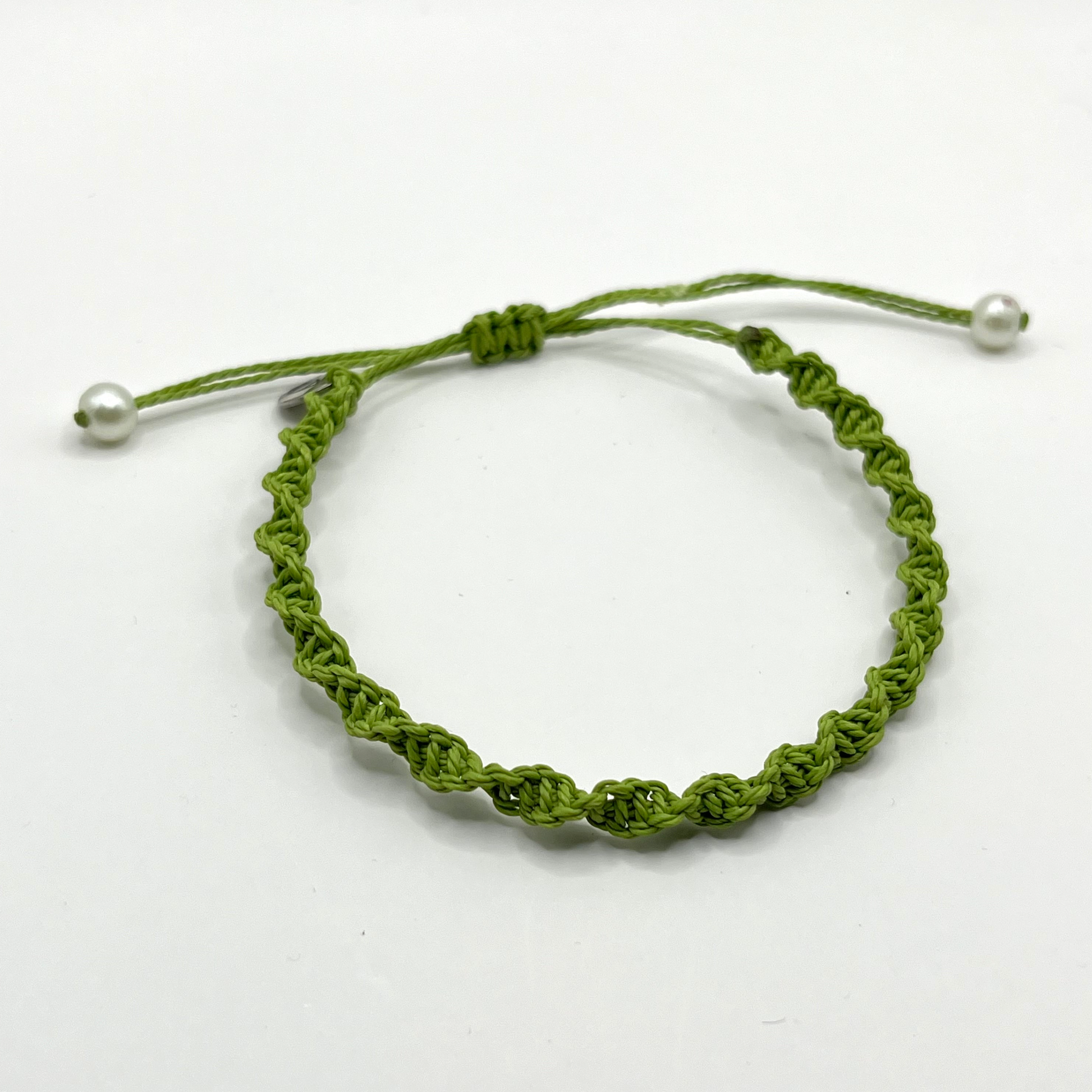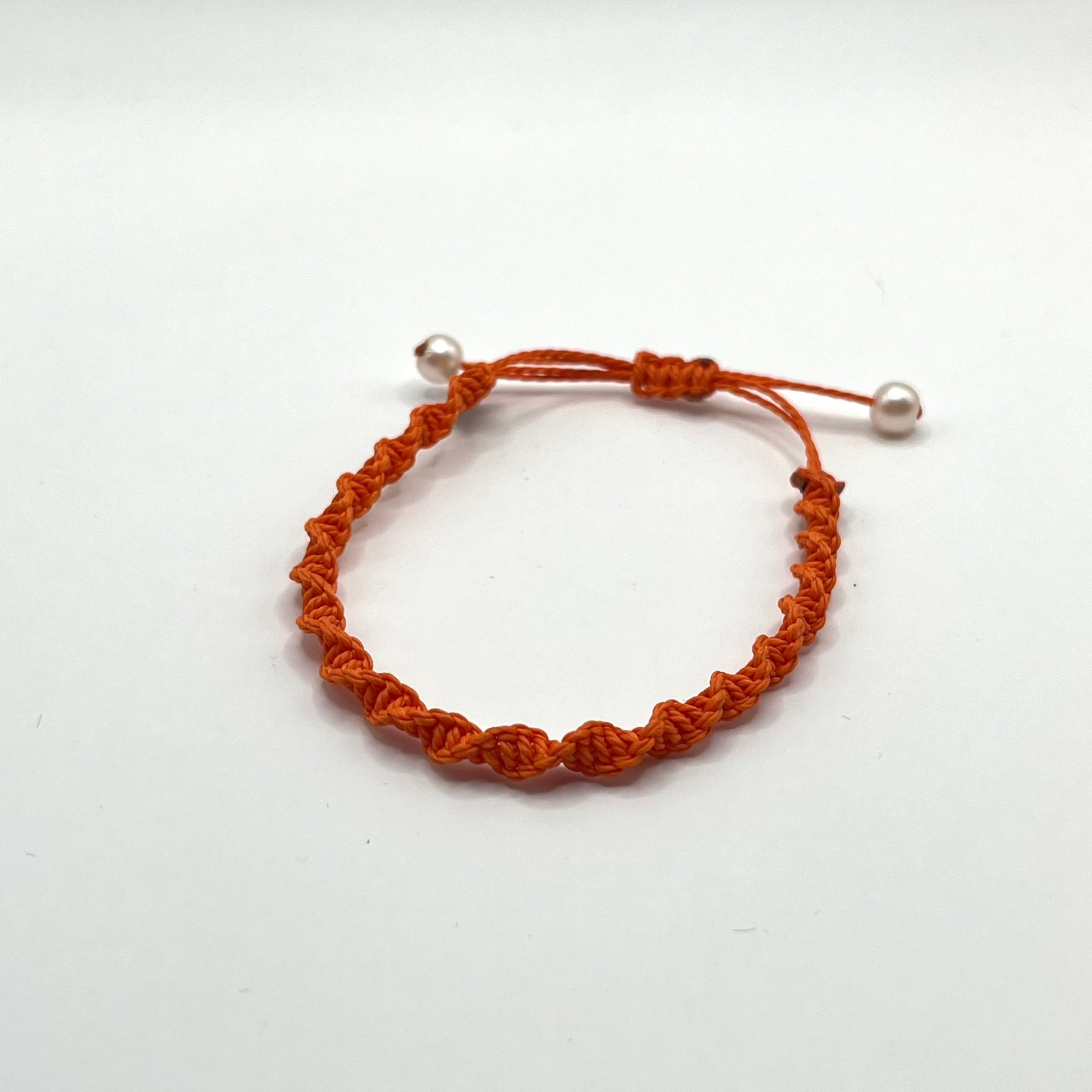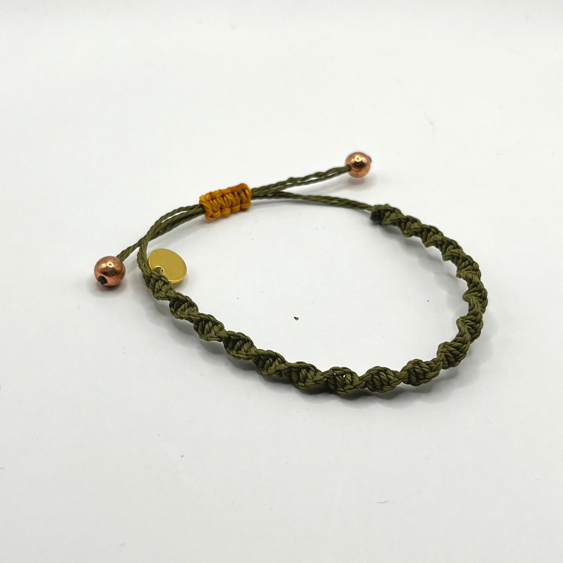 Et håndlaget, spiralflettet armbånd i jordens farger.