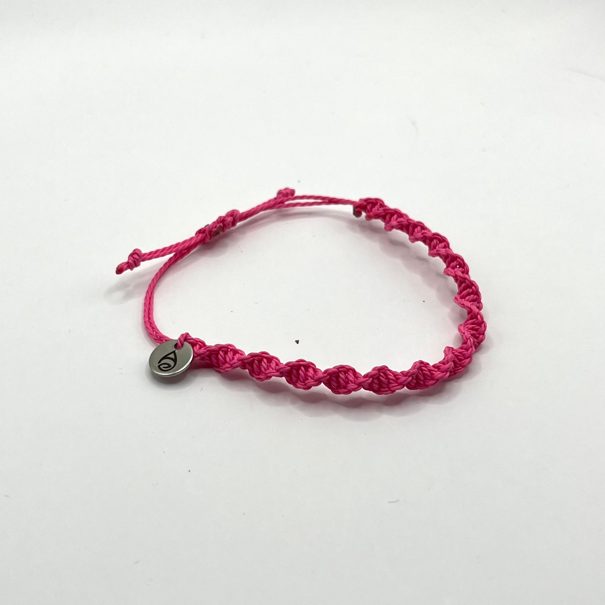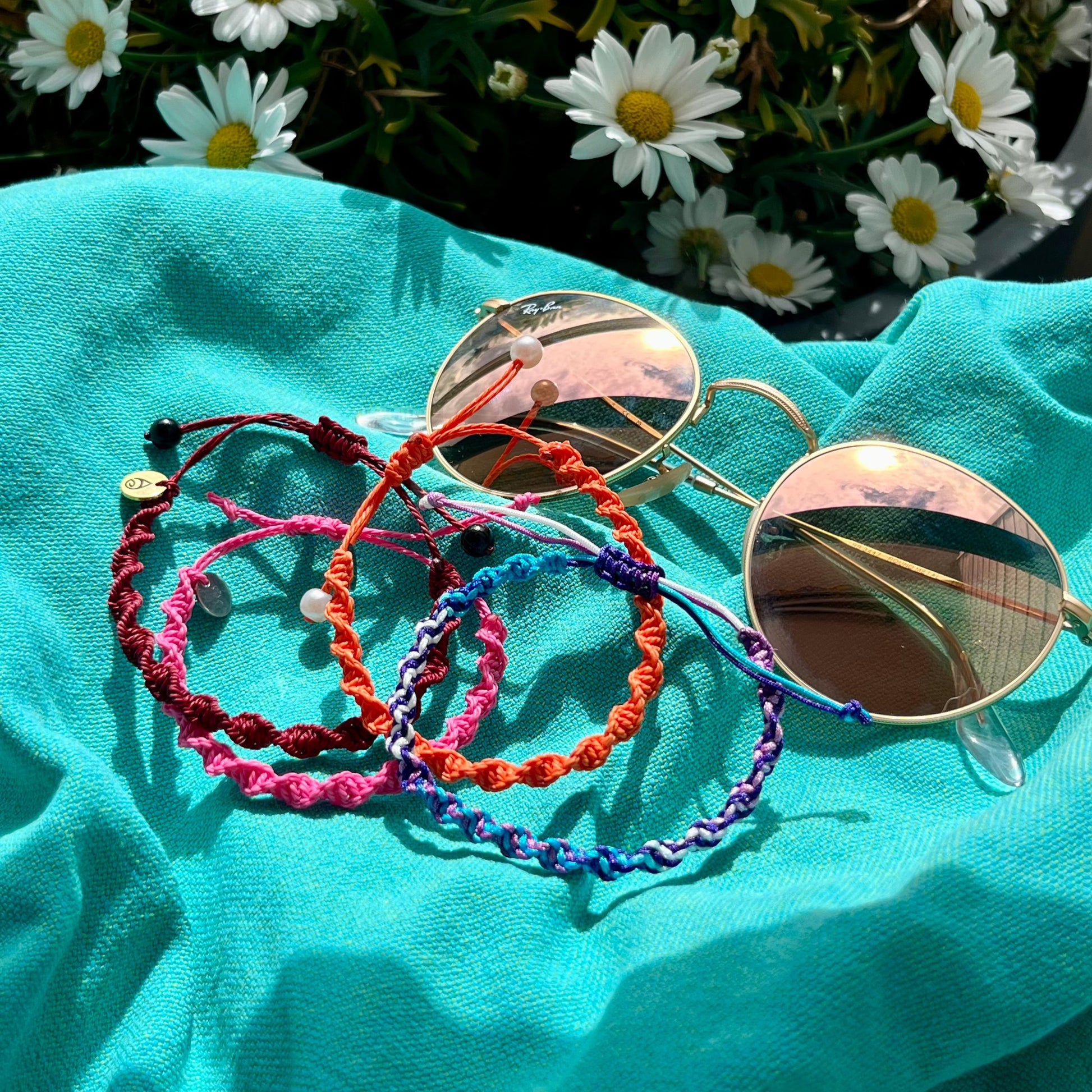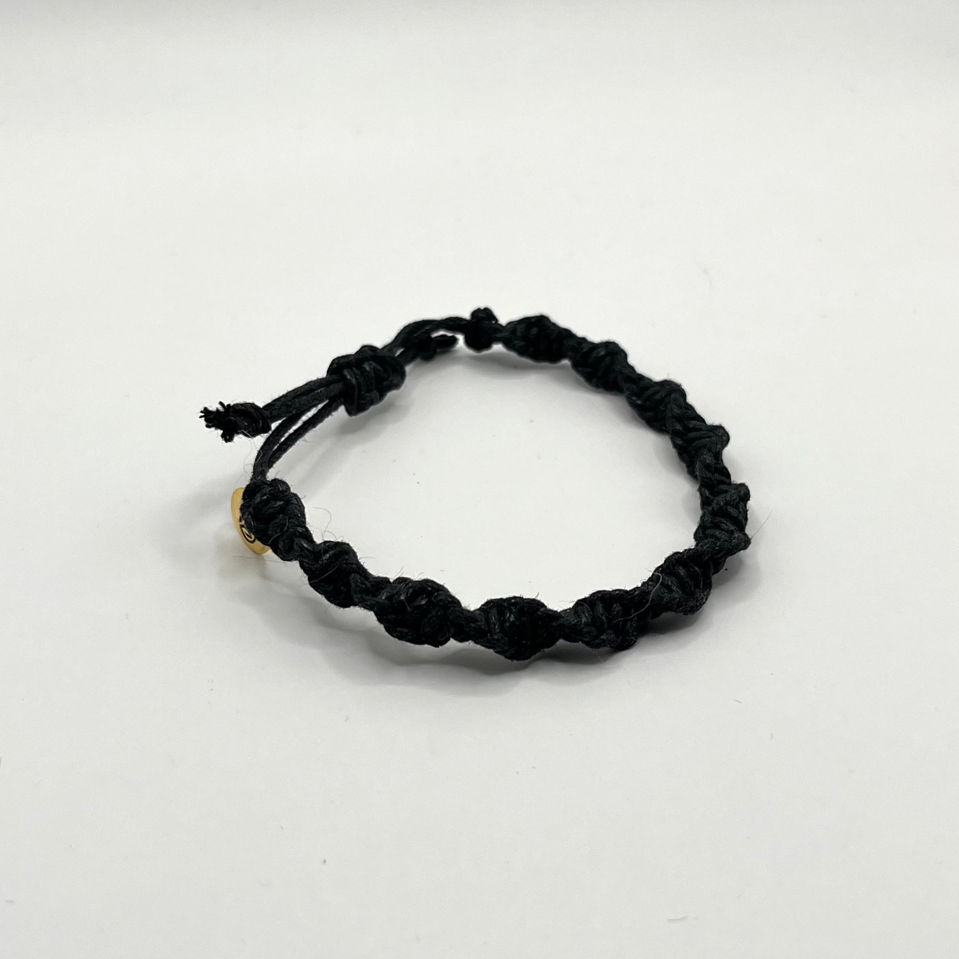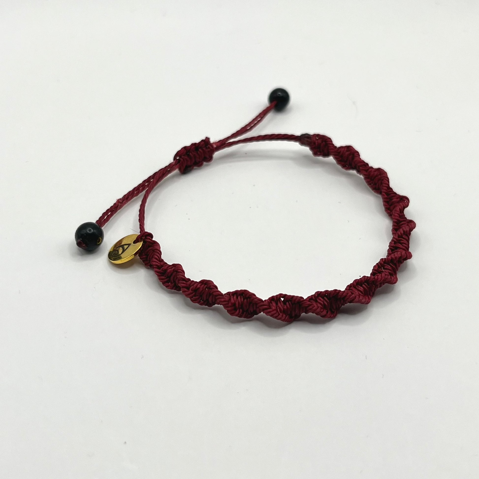 Et håndlaget, spiralflettet armbånd i jordens farger.