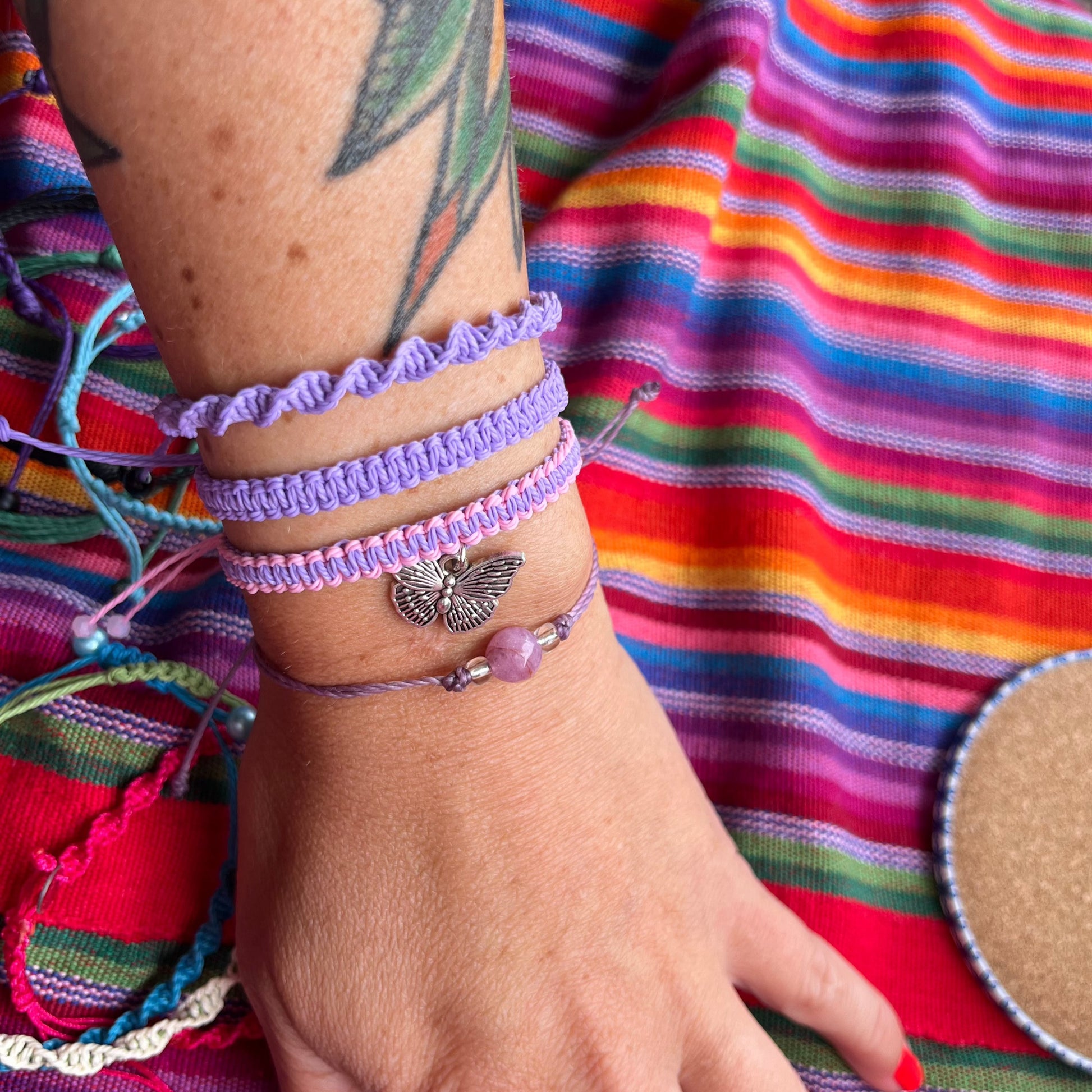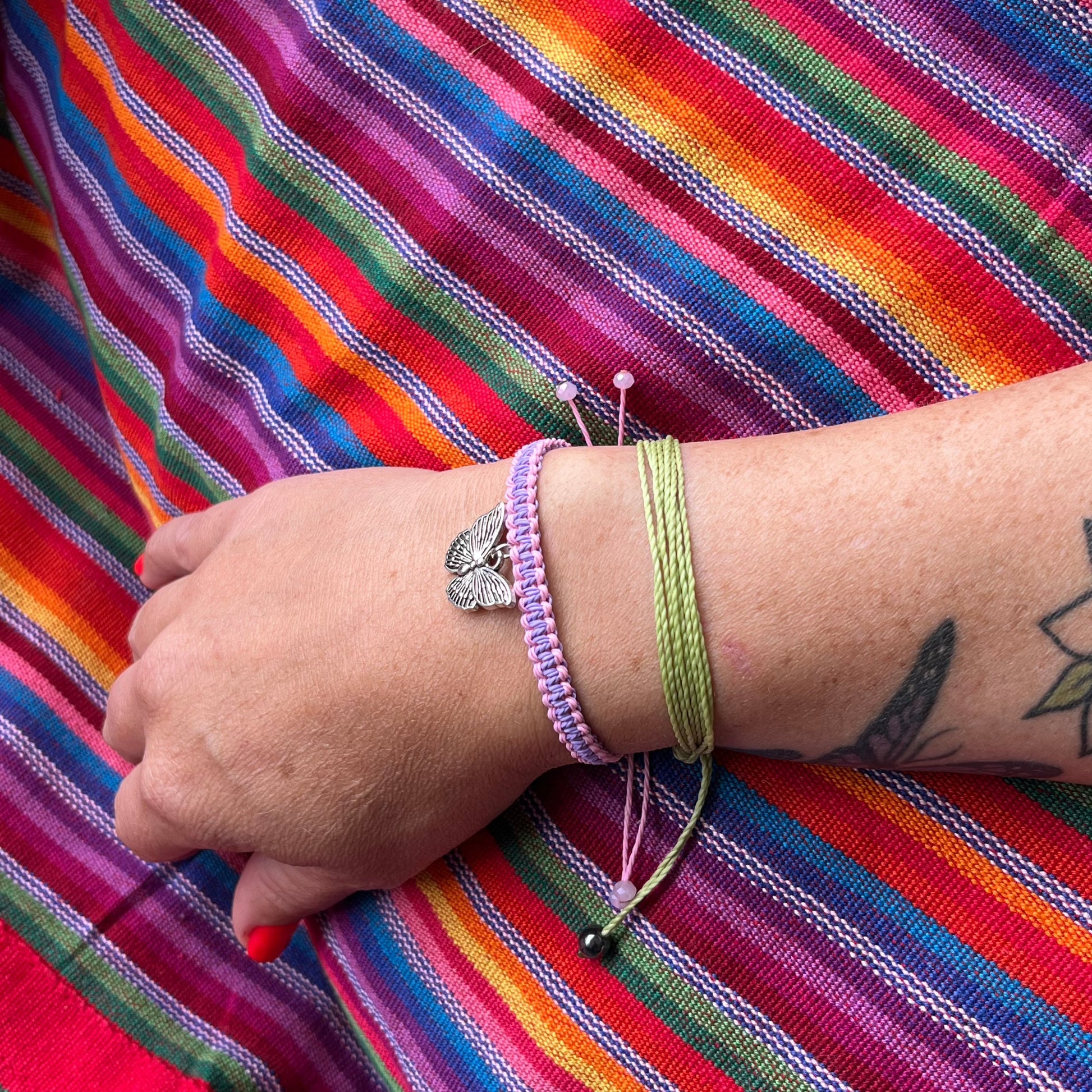 Et vakkert, justerbart armbånd i lys rosa og lys lilla med en hengende sommerfugl i rustfritt stål. 🦋